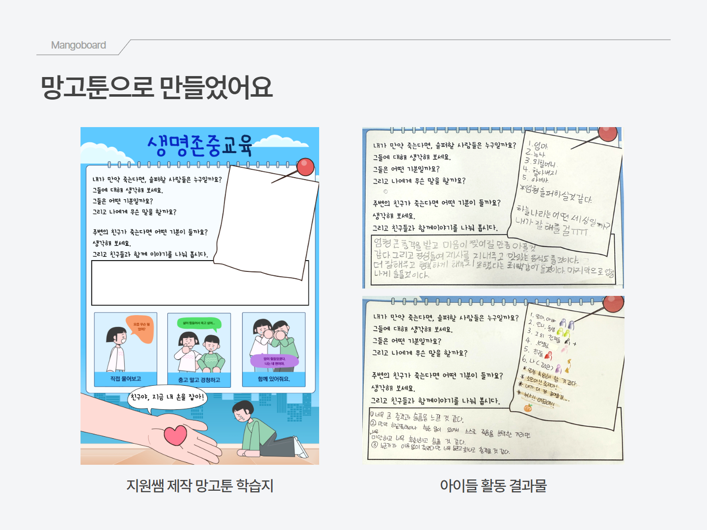 마지막으로 작업 스트레스가 확 줄었다는 점이에요. “디자인 잘해야 한다”는 부담이 많이 줄고 “어? 이렇게 간단하게 돼?” 하며 작업에 재미가 붙더라고요. 학교와 아이들 반응도 좋았지만, 저에게는 업무 효율과 정서적인 여유가 생겼다는 게 가장 큰 변화였어요. 자료 제작 과정이 가벼워지니까 “다음 계기교육 자료도 망고보드로 만들어봐야겠다”는 생각이 자연스럽게 들었습니다.