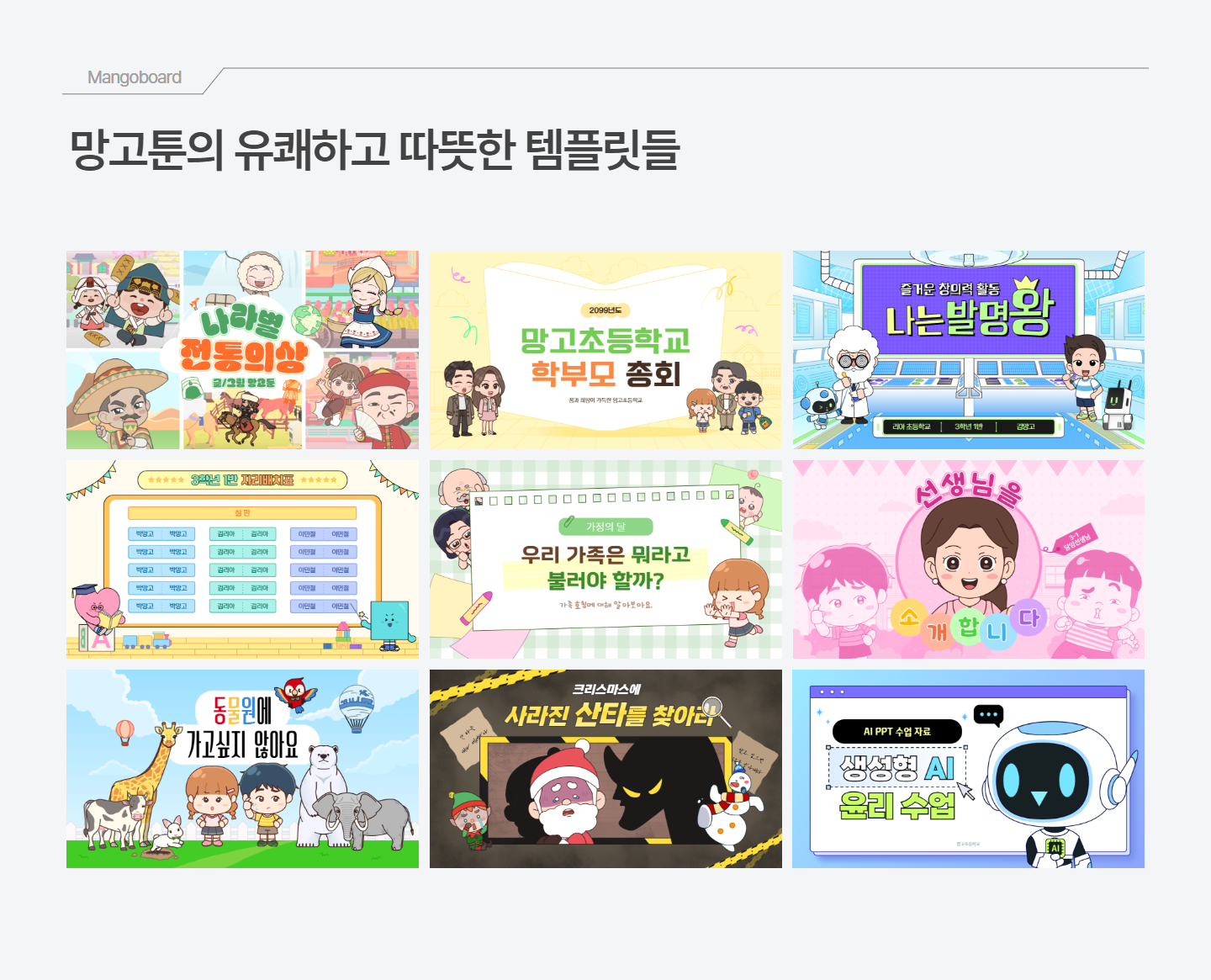 올해 망고툰 쌤배서더 활동을 하면서 망고툰의 감성과 실용성에 더 깊이 빠졌어요. 캔바나 파워포인트에서는 잘 나오지 않는 유쾌하고 따뜻한 분위기가 너무 좋았고, 학생 계정을 발급 받아서 수업에도 적극 활용했는데 아이들이 캐릭터나 요소들을 정말 좋아하더라고요.