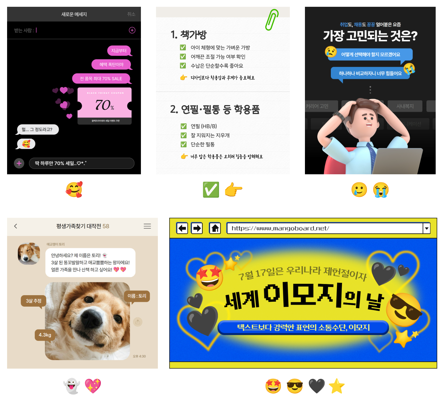 이모지는 텍스트보다 빠르게 시선을 끌고 말 대신 감정을 전달하는 데 특히 효과적이죠!